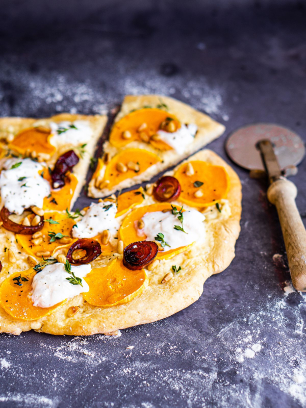 Pizza met pompoen, burrata, balsamico-uitjes en tijm